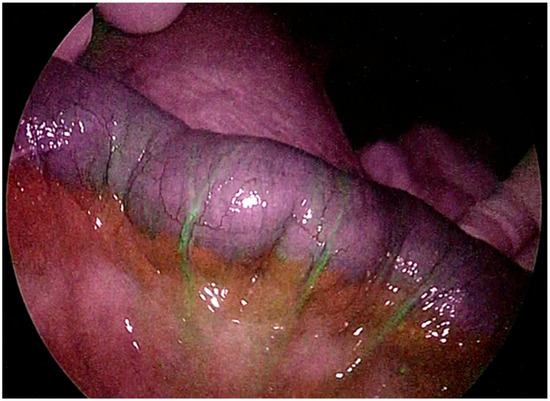 Regarding perfusion assessment, ICG finds valuable utility, particularly in evaluating anastomotic leakage [26,27,28]. The occurrence of anastomotic leaks varies according to the surgical procedure, with rates of this concerning postoperative complications reaching up to 19% [29,30]. In any gastrointestinal surgical procedure involving resection, ensuring proper healing of the anastomosis is crucial, requiring adequate vascularity and tension-free connections (Figure 1). ICG offers a valuable means to intraoperatively evaluate anastomotic perfusion [31,32,33,34,35]. In 2018, Ris et al. conducted a multicenter, prospective, phase II study aiming to evaluate the potential of indocyanine-green-guided fluoresce angiography (ICG-FA) in guiding the selection of intestinal transection levels and assessing subsequent anastomotic vascular sufficiency. This study enrolled 504 patients who underwent colorectal resection for benign and malignant diseases, defining anastomotic leakage (AL) according to Clavien–Dindo (CD) grade ≥ 3. Among them, the planned transection line was adjusted based on ICG-FA findings in 24 patients (4.7%). In five out of ninety patients who underwent low anterior resection, the decision to construct a diverting stoma was reconsidered based on ICG-FA results. Consequently, the surgical approach was modified for 29 patients (5.8%) due to the utilization of ICG-FA. The overall AL rate for colorectal resection in this study was 2.6%, significantly lower than the rate of 5.8% observed in 1173 procedures performed without ICG-FA at the participating centers [36]. In 2019, Dinallo et al. conducted a retrospective study involving 554 cases of colorectal resection, comparing those with and without ICG-FA for benign and malignant diseases. The study found no significant difference in AL rates between the ICG-FA and control groups. However, the transection line was adjusted in 5.6% of cases in the ICG group, which was significantly higher compared to the control group [37]. However, the majority of these studies were single-center investigations, and considerable discrepancies existed in the definition of AL, the specific disease under study, the surgical procedures performed, and various other background factors influencing the occurrence of AL. In 2020, Alekseev et al. presented the findings of the FLAG trial, a randomized controlled trial conducted at a single center in Russia, which involved 377 patients undergoing sigmoid and rectal resection. The results revealed a notable reduction in the rate of anastomotic leakage (AL) in the ICG-FA group compared to the control group, particularly among the 216 patients who underwent low anastomosis [38]. In 2021, Jafari et al. presented findings from the PILLAR-III trial, a multicenter randomized controlled trial conducted across 25 U.S. centers. This trial enrolled 347 patients with rectal neoplasms who underwent low anterior resection with anastomoses located less than 10 cm from the anal verge. The study results did not indicate a significant reduction in the AL rate in the ICG-FA group compared to the control group [39]. Thus, while previous randomized controlled trials did not provide evidence suggesting a significant reduction in AL rates with the use of ICG-FA, recent developments have emerged. The authors of a randomized control trial (RCT) conducted in Japan presented promising findings at the 30th International Congress of Endoscopic Surgery in the European Union in 2022. This study, known as the EssentiAL study, was a multicenter RCT involving 41 Japanese centers analyzing 839 patients who underwent sphincter-preserving surgery for rectal cancer. The results demonstrated a significantly lower AL rate in the ICG-FA group compared to the control group.