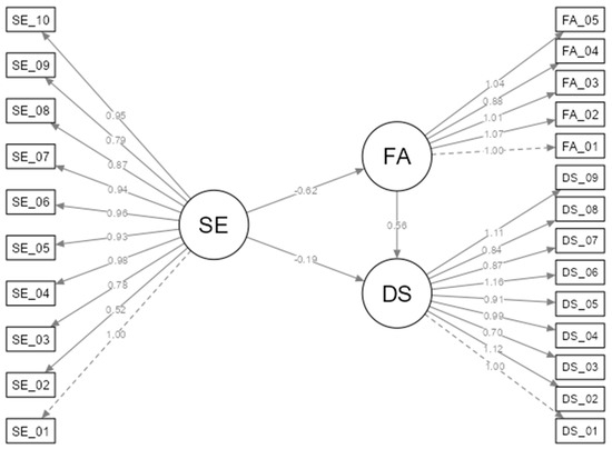 As shown in Table 2, a convergent validity showed that AVE was higher than the recommended value of 0.50 [82] in self-efficacy, future anxiety, and depression symptoms, indicating that these three variables share a high degree of variance and are meaningfully interrelated. Furthermore, the square root AVE for each construct was higher than the construct’s correlations with other scales, ensuring appropriate discriminant validity between these three variables [83]. In addition, the heterotrait-monotrait (HTMT) ratio of correlations ranged between 0.62 and 0.76, suggesting an acceptable level of discriminant validity (HTMT < 0.85), which reflects the extent to which a construct better explains the variance in its own indicators, compared to the variance of other constructs [82]. Therefore, the convergent and discriminant validation was confirmed in the mediation model.