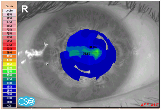 The corneal topography shows an irregular pattern with steppening in correspondence with the nodules and flattening of the opposite sectors (Figure 3). In advanced SND, when a circular distribution of the nodules occurs, significant central flattening is observed (Figure 4).