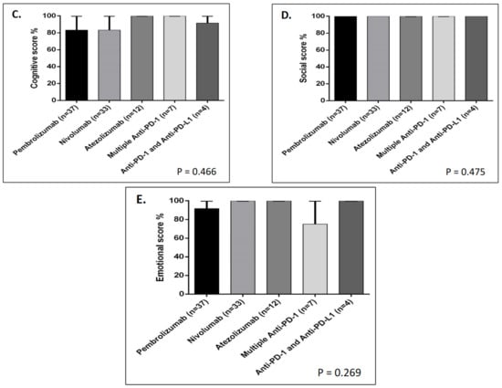 Regarding the global health assessment, all combined groups scored > 80/100 (Table 2). Nevertheless, nivolumab-treated patients exhibited the worst, yet not significantly so, health compared to that of the other groups (Table 2 and Figure 2C). Further information regarding the scores for global health-related questions and the proportion of patients answering these questions is shown in Table 2 and Table 3.