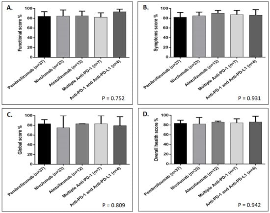 When investigating patient functioning (role, cognitive, emotional, etc.), we found comparable, non-significantly different levels among treatment groups. However, patients treated with single anti-PD-L1 and, in particular, anti-PD-1 agents, reported lower physical, role, and cognitive functioning scores than those treated with multiple anti-PD-1 and more specifically, combination therapy. Interestingly, patients treated with combination therapy tended to have better overall functioning, reflected by higher questionnaire scores than those treated with multiple anti-PD-1, single anti-PD-1, or anti-PD-L1 agents. This is in contrast to the results published by Looman et al., in which patients treated with combination therapy (ipilimumab/nivolumab) reported lower HRQoL scores compared to those treated with anti-PD-1 therapy []. This controversy could be attributed to the fact that the use of ipilimumab in the combination therapy investigated by Looman et al. has shifted toward pembrolizumab and nivolumab over ipilimumab, given the superiority of newer agents in regards to health-related outcomes []. Cumulatively, the overall scores of all functioning were reasonable reflected by a median score of 84.7/100 in all study cohorts.
