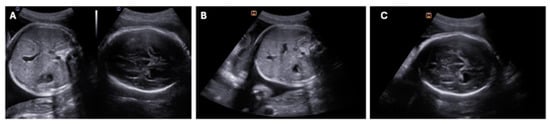 - Dommergues, M.; Petitjean, J.; Aubry, M.; Delezoide, A.; Narcy, F.; Fallet-Bianco, C.; Freymuth, F.; Dumez, Y.; Lebon, P. Fetal enteroviral infection with cerebral ventriculomegaly and cardiomyopathy. Fetal Diagn. Ther. 1994, 9, 77–78. [Google Scholar] [CrossRef]