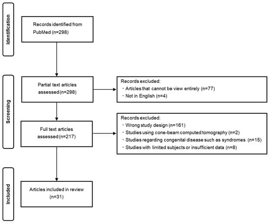 Figure 1 shows the PRISMA flow diagram for the literature search. During our literature search, 298 relevant articles were found and 217 articles were selected after partial text article assessment was used to exclude articles that could not be viewed entirely (n = 77) or were not in English (n = 4). After the full-text article assessment of the 217 articles, 31 articles met each criterion and were included in this review. We classified these articles according to whether or not chemotherapy was administered. Articles that investigated the effect of chemotherapy in a chemotherapy group and a control group were included in the tables independently. Of the 31 articles, 27 included information about the prevalence of dental abnormalities in the general population (Table 1) [15,16,17,18,19,20,21,22,23,24,25,26,27,28,29,30,31,32,33,34,35,36,37,38,39,40,41]. Most studies focused on school-age children or teenagers. On the other hand, there were six articles that included patients who had undergone cancer treatment or chemotherapy, and this is shown in Table 2 [22,33,42,43,44,45]. The subjects were school-age children or older, as in the general population.