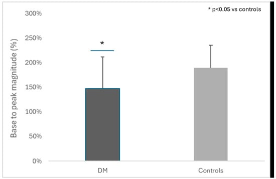 During reperfusion, peak flux increased in both groups. Patients with DM, however, exhibited a smaller peak magnitude (Figure 1) compared to controls (147.0 ± 64.7% vs. 189.4 ± 46.0%, respectively; p < 0.05). Moreover, cIMT, even though in the normal limits, was higher in patients with DM compared to controls (0.68 ± 0.09 mm vs. 0.60 ± 0.08 mm, respectively; p < 0.01).