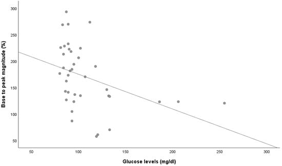 In the univariate analysis, peak magnitude was inversely correlated with age (r = −0.341, p = 0.031), office systolic BP (r = −0.400, p = 0.011), glucose levels (r = −0.543, p < 0.001, Figure 2) and triglycerides (r = −0.363, p = 0.029). In addition, a significant negative association was found between peak magnitude and cIMT (r = −0.388, p = 0.016). No significant correlations were observed between the other microvascular-related variables (baseline flux, percentage decrease during occlusion and peak flux) with glucose levels or other baseline characteristics.