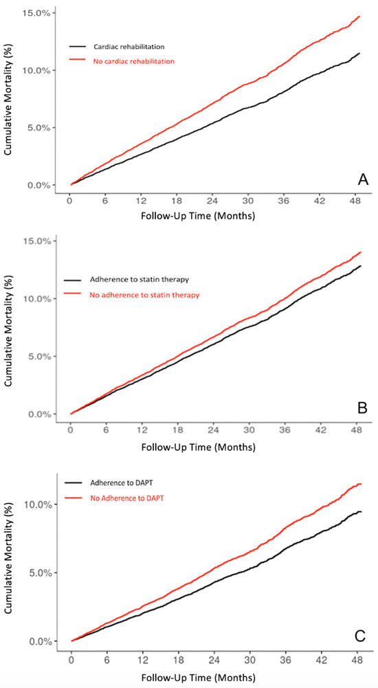 Cumulative mortality comparing individuals with and without adherence to (A) cardiac rehabilitation (p < 0.001); (B) high-intensity statin therapy (p < 0.001); (C) DAPT (p < 0.001). Dual antiplatelet therapy (DAPT).