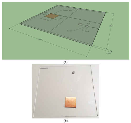 Presentation of (a) a schematic diagram of the radiography phantom and attenuators (reproduced from [13] with permission) and (b) a photograph of the phantom.