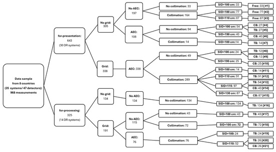 Distribution of the pilot study into different cohorts based on the image type (raw or processed) and the acquisition conditions (grid: yes/no; AEC: yes/now; collimation: yes/no; TB/CB/free and SID) used.