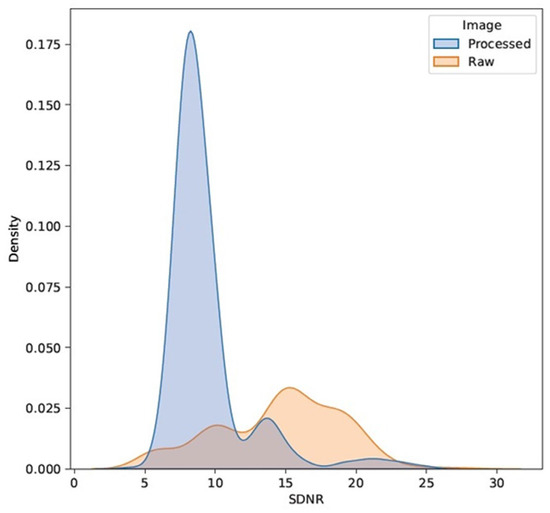Density distributions of the SDNRs for the processed/raw image cohorts.