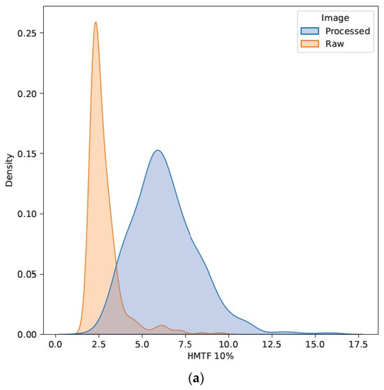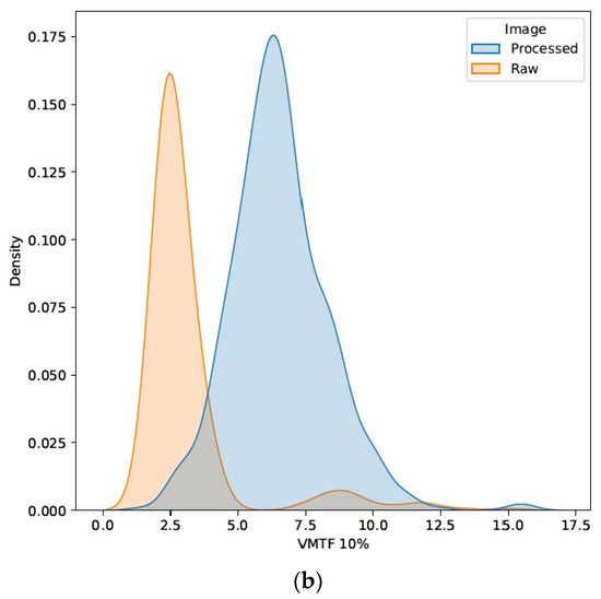 The large magnitudes and variations in the image quality parameters are further exemplified for SDNR, as well as the horizontal and vertical 10% MTFs, in Figure 3 and Figure 4, respectively. These figures show the density distributions smoothed with a Gaussian kernel for visualization purposes with a color-coded separation of the two major data cohorts of processed and raw images. Two distinct modes are apparent as a function of image processing, as was observed in the residual IQ parameters considered in this study (not graphed).