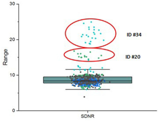 Box plot of the SDNRs for the processed images cohort. Outliers in the data and associated data set IDs are indicated.
