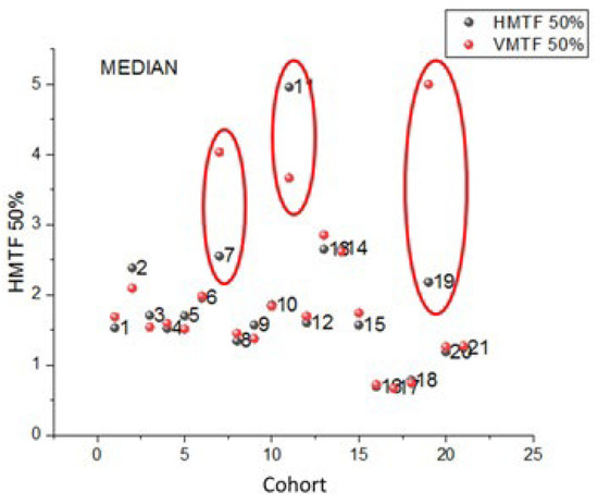 In order to evaluate the use of Cu targets, deviations between the medians of the 50% horizontal and vertical MTFs are plotted in Figure 6 for all 21 cohorts (cf. Figure 2). The horizontal and vertical MTFs are color-coded in black and red, respectively; Cohort IDs are added to the data points. In comparison, the encircled Cohort IDs #7, #11, and #19 exhibit significant differences between their horizontal and vertical MTF values (all p-values < 0.01, paired t-test). Cohorts #7, #11, and #19 are each represented by a single data set with IDs #7, #6, and #5, respectively.