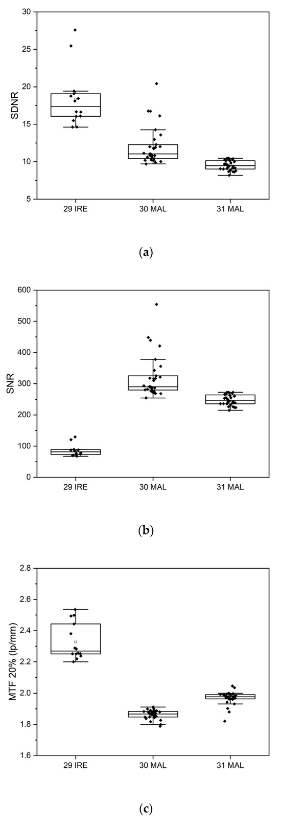 Box plots for the comparison of (a) SDNR, (b) SNR, and (c) MTF20% for data sets #29, #30, and #31.
