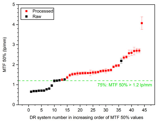 In Figure 8, horizontal MTF 50% values are sorted in increasing order. In the figure, the raw-image-derived (black dots) and processed-image-derived (red squares) MTF 50% values are compared across different DR systems. The horizontal green dashed line represents the threshold at which 75% of the systems have an MTF 50% value greater than 1.2 line pairs per millimeter (lp/mm). Key observations from the graph include that processed images generally exhibit higher MTF 50% values compared to raw images and, thus, confirming that postprocessing enhances the perceived spatial resolution. Furthermore, there is a notable variability in MTF 50% values across the data sets, with some DR systems showing much higher values than others, reflecting differences in the system performance and image processing algorithms. The error bars on each data point indicate the range of variability or uncertainty in the measurements, further highlighting the differences between raw and processed image quality metrics.