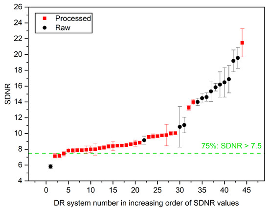 Figure 9 displays the SDNR values sorted in increasing order, comparing raw-image-derived (black dots) and processed-image-derived (red squares) SDNR values across different DR systems. The horizontal green dashed line represents the threshold at which 75% of the systems have an SDNR value greater than 7.5. As shown in the graph, the processed images generally exhibited lower SDNR values compared to the raw images across most DR systems, indicating that postprocessing may reduce the apparent signal difference relative to noise.