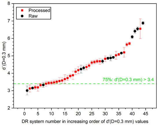 Figure 10 displays the detectability index, d′, for a virtual disk with a diameter of 0.3 mm, sorted in increasing order. Again, the graph compares the d′ derived from raw images (black dots) and processed images (red squares) across different DR systems. The horizontal green dashed line represents the threshold at which 75% of the systems have a d′ value greater than 3.4. The raw images generally exhibited higher d′ values compared to the processed images across most DR systems, indicating that raw images may better reflect the detectability of small details.