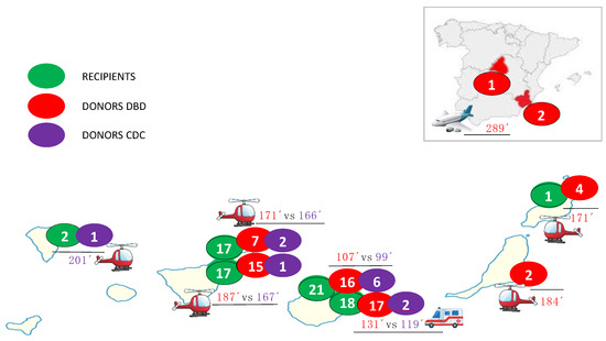 - Groba Marco, M.D.V.; Portela Torron, F.; Peña Morant, V.; Romero Lujan, J.L.; Galvan Ruiz, M.; Santana Ortega, L.; Borque Del Castillo, E.; Martínez de Saavedra Álvarez, M.T.; Plaza Perez, M.L.; Medina Gil, J.M.; et al. Cardiac Transplantation on the Canary Islands, A European Ultraperipheral Region: Organization, Optimized Utilization of Local Donors, and Early Transplant Outcomes. Transplantation 2023, 107, 2443–2446. [Google Scholar] [CrossRef] [PubMed]