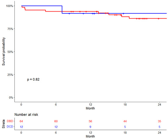 The median follow-up period for the overall cohort was 26 months (IQR: 14.9–38.9 months), and the KM estimates of 30-day survival were 96%, while 6-month survival was 95% and 1-year survival was 93%. For DCD recipients, the follow-up period was 15.2 months [IQR: 11.9–28.0 months], while for DBD recipients, it was 27.5 months [IQR: 16.5–42.2 months], p = 0.027. There were no significant differences in survival rates between DCD and DBD recipients. The 6-month survival for DCD was 100%, compared to 93.8% for DBD recipients. The 30-day survival was 100% for DCD and 95.3% for DBD, and the 1-year survival rate was 91.7% for DCD recipients compared to 93.8% of DBD recipients (p = 0.82) (Figure 2).