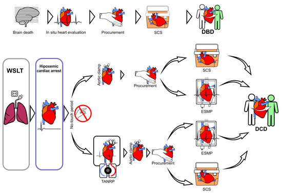 Two main methods of reperfusion and four different techniques have emerged for the procurement and preservation of DCD hearts (Figure 3) [20]. The first two methods are performed by direct procurement (DP) after circulatory death with SCS and transplantation (in disuse) or ex situ perfusion outside the donor, using ex situ machine perfusion (ESMP), which allows the assessment of cardiac functionality before transplantation. The other two methods are performed inside the donor, using TANRP with an open cardiopulmonary bypass circuit or ECMO and subsequent ESMP or traditional SCS.