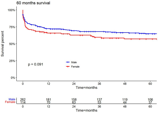 The in-hospital mortality of the whole cohort was 27% (102 patients). Males and females had similar rates of in-hospital mortality at 26% and 29%, respectively. Female patients had higher rates of long-term mortality than male patients at 46% and 36%, respectively; however, this difference was not statistically significant (Table 3). The five-year KM survivability curves were lower but did not statistically differ between female and male patients (p = 0.091) (Figure 1).