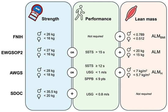 The definition of sarcopenia has evolved over time. Initially defined by Rosenberg in 1989 as a reduction in lean body mass that affects ambulation, mobility, and independence [], sarcopenia was more recently defined in 2020 by The Position Statements of the Sarcopenia Definition and Outcomes Consortium (SDOC) as a reduction in muscle strength and physical performance, without considering lean body mass []. Over the past decade, four different consensuses have been published: The Foundation for the National Institutes of Health (FNIH) [], The European Working Group on Sarcopenia in Older People-2 (EWGSOP2) [], The Asian Working Group for Sarcopenia (AWGS) [], and the SDOC []. These definitions include simplified algorithms with specific cut-off points to facilitate the diagnosis of sarcopenia in research and clinical practice. However, the prevalence and impact of sarcopenia are largely determined by the diagnostic criteria used, as well as the characteristics of the population being studied. For example, the prevalence is higher among patients and those living in long-term care institutions compared to those living in the community [,] and ranges from 10% to 27% globally depending on the diagnostic criteria used [].