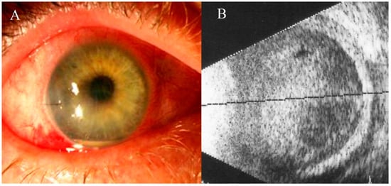 Prevalent signs of EE: (A) corneal decompensation and fibrin/hypopyon (B), ocular ultrasound scan showing infiltration of the vitreous cavity and retinochoroidal thickening.