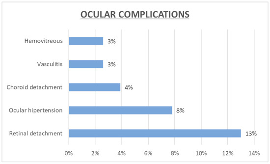Various ocular complications were observed following treatment. The most frequently reported complication was retinal detachment or tears, affecting 13.0% of the treated individuals. An increase in intraocular pressure was noted in 7.8% of patients, while hemovitreous was observed in 2.6% of patients. Similarly, vasculitis occurred in 2.6% of patients. Choroidal detachment was slightly more prevalent, affecting 3.9% of patients, whereas panophthalmitis occurred in 10% of patients (Figure 2).