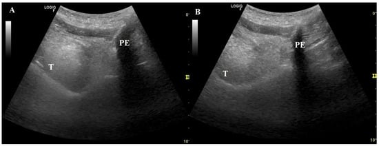A patient affected by amyotrophic lateral sclerosis with no bulbar dysfunction; (A) background movement of tongue during insufflation. (B) Decreased diameter of pre-epiglottic space during exsufflation. Set parameters: insufflation pressure, +40 cmH2O; insufflation time, 1.5 s; high flow; exsufflation pressure, −40 cm2O; exsufflation time, 2.5 s; peak cough flow generated, 4.7 L/s. T = tongue; PE = pre-epiglottic space.