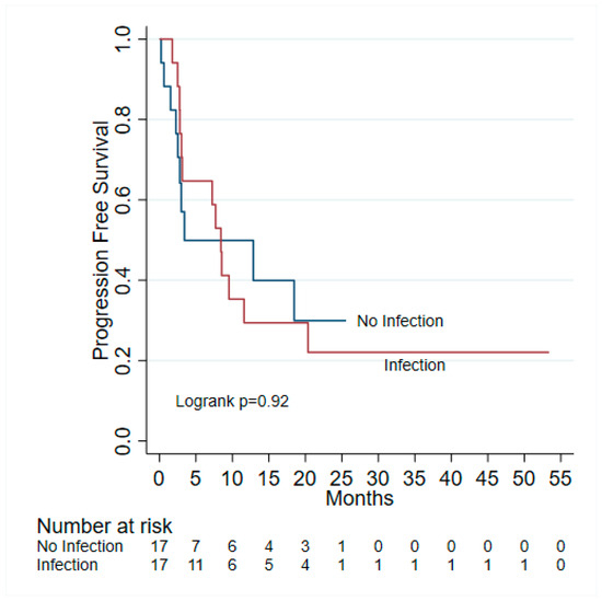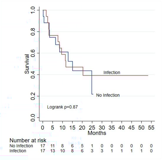 A total of 10 (29.41%) of 34 patients experienced irAEs; of those, 6 of 17 (35.29%) occurred in the infected cohort and 4 of 17 (23.53%) in the non-infected cohort (p = 0.71) (Table 1). At the last follow-up, 19 (55.88%) of 34 patients had died, 9 (52.94%) of 17 patients from the non-infected cohort and 10 (58.82%) of 17 patients from the infected cohort (p = 1.0) (Table 1). The median follow-up time was 11.7 (IQR: 7.7–23.1) months and 8.57 (IQR: 3.27–20.03) months for infected and non-infected, respectively—there were no statistically significant differences in OS and PFS between infected and non-infected (Figure 1 and Figure 2). Of 17 patients, 11 (64.71%) had a delay or interruption in their treatment due to their infection, while 7 (41.18%) of 17 patients had their treatment discontinued as a result of their infection. Although infections were not statistically associated with either OS or PFS, some risk factors substantially impacted OS and PFS. Use of immunosuppressives (HR = 11.32, 95% CI 1.87–68.44, p = 0.008) and ICU admissions (HR = 3.67,95% CI 1.24–10.86, p = 0.019) were significantly associated with a higher risk of death. The number of ICI cycles was positively associated with OS (HR = 0.88, 95% CI 0.81–0.95, p = 0.002) and PFS (HR = 0.85, 95% CI 0.78–0.93, p < 0.001), whereas the number of ED visits was positively associated with PFS (HR = 0.30, 95% CI 0.10–0.90, p = 0.032) (Table 3).