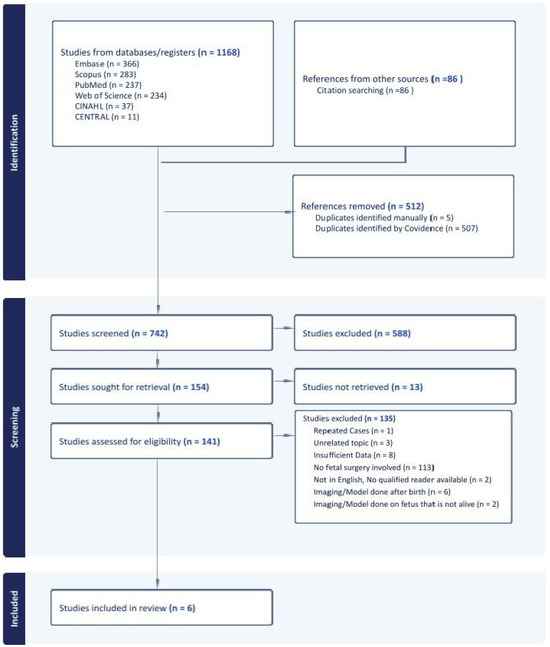 The database search, along with a search of selected article citations, identified 1254 articles. Using automatic and manual comparison, 512 duplicates were removed, leaving 742 unique citations. After screening by title and abstract, 588 studies were excluded, with 154 remaining for full-text review. Upon reading the remaining citations, only six were found to meet the inclusion criteria and were included for data extraction. Studies were excluded upon full-text review for the following reasons: unrelated topic (3), insufficient data (8), full text not available (13), no fetal surgery involved (113), not in English with no qualified reader available (2), imaging/model performed after birth (6), repeated cases (1), and imaging/Model performed on a fetus that is not alive (2). Insufficient data were invoked when a study tangentially mentioned the use of printing in fetal surgery without providing case details or how the print was used. The full PRISMA flowchart can be seen in Figure 1 and characteristics of the extracted articles can be found in Table 1. Included studies used 3D prints for the surgical planning of spina bifida repair (2) or the determination of need and methodology for an EXIT procedure to secure the fetal airway (4).