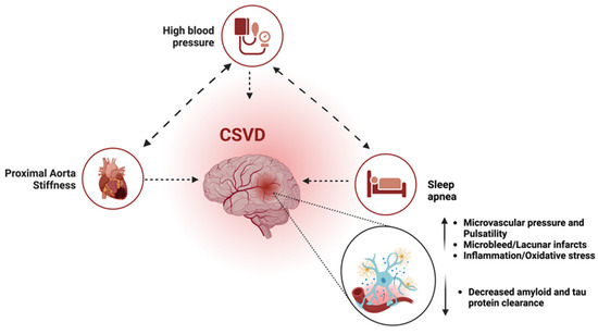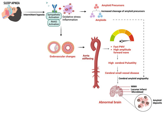 OSA-induced increased vascular resistance has been linked to the development of systemic hypertension, which has been linked to apnea-induced sympathoexcitation, oxidative stress, and endothelial dysfunction [154,155]. There appears to be a dose-response relationship between the severity of OSA and the odds ratio for the development of systemic hypertension, which is responsible for many cardiovascular and cerebrovascular consequences [54,156,157,158]. The proximal aorta becomes prone to arterial stiffness in systemic hypertension and increasing age [125,129,130,147]. This results in the impaired ability of the proximal aorta to act as a buffer between heart and brain perfusion, an important coupling device that regulates the amount of pressure and flow pulsatility transmitted into the brain microcirculation [29,124,126,127,128]. Impaired pressure regulation at the aortal level could damage small vessels with low resistance and drive a pathophysiological cascade, contributing to cerebral small vessel disease and amyloid buildup [121,152,153].