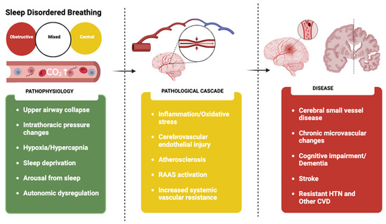 Several studies have identified OSA and hypertension as independent risk factors not only for the development of cerebrovascular disease but also for worse outcomes, exacerbations, and repeat cardiovascular events [14,18,139,140,141]. In the discussion of neurocognitive abnormalities, OSA and hypertension are known to trigger cerebral hypoperfusion and glucose hypometabolism [116,142]. These conditions, along with aging, hypoxia, inflammation, and oxidative stress, synergistically promote diverse pathological mechanisms, including cerebral hypoperfusion and glucose hypometabolism, which precede neurocognitive decline [56,116,142].