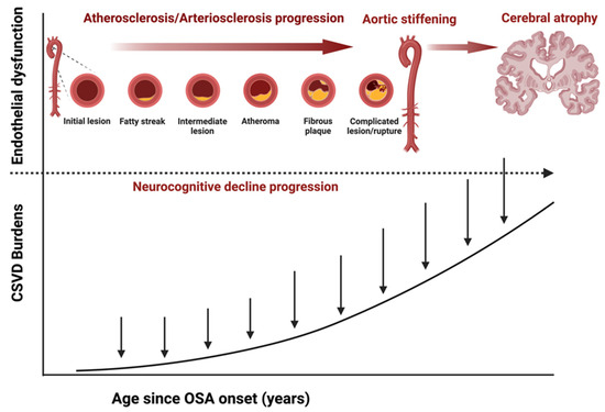 Some research on the brain has found a correlation between OSA and an increase in amyloid burden, potentially indicating an early pathomechanism in the development of neuronal damage and neurocognitive abnormalities. Amyloid burden refers to the accumulation of amyloid-beta (Aβ) proteins in the brain, a hallmark of Alzheimer’s disease [159]. Current evidence suggests cerebral dysregulation is associated with increased cerebral amyloid burdens in patients with OSA due to endothelial stiffness in cerebrovasculature and decreased sleep-based clearance mechanisms [119,159,160]. Endothelial stiffness is a term used to describe the diminished flexibility in the lining of blood vessels. This condition can interfere with the balance within the vascular system, potentially causing vascular damage and leading to metabolic disorders and diseased states in organs such as the heart and brain. The combined role of OSA-induced sleep disruptions and impaired vascular compliance could hinder the sleep-dependent clearance processes crucial for eliminating brain waste products during sleep [119,159,160]. Figure 5 depicts the progressive vascular sequences and the temporal impact of CSVD burden leading to neuropathological conditions observed in patients with SDB.