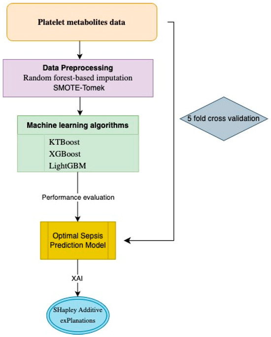We used the XAI approach to understand the prediction judgments produced by the models. XAI seeks to provide transparency and reliability in AI applications by making the sophisticated machine learning models’ choices and behavior understandable to people. XAI techniques can find important traits, expose biases, and improve the dependability of AI systems by offering insights into how models create predictions. This is especially useful in vital domains like bioinformatics and healthcare. Based on this information, the SHapley Additive exPlanations (SHAP) method was applied to determine the importance of biomarker candidate metabolites in predicting sepsis and to explain the outputs of the model from a clinical perspective. SHAP values are based on cooperative game theory and provide a unified measure of feature importance by considering the contribution of each feature to the prediction. This technique determines the average marginal contribution of each characteristic over all possible combinations, guaranteeing a consistent and fair assignment of significance. By displaying SHAP values, we can comprehend the influence of each feature on individual predictions and the entire model, providing a better understanding of the model’s decision-making process and boosting interpretability [67,68,69,70]. The flow chart for the proposed methodology is presented in Figure 1.