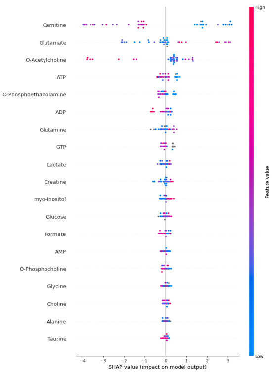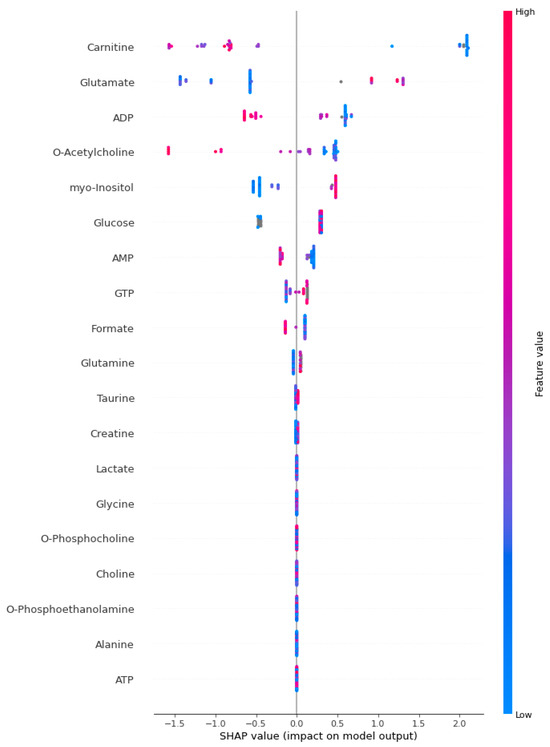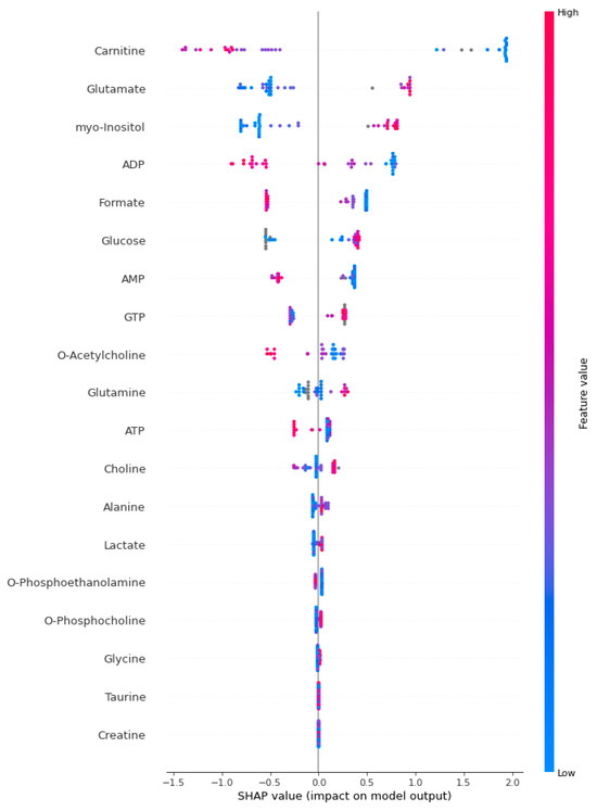 Figure 2, Figure 3 and Figure 4 present the SHAP summary plot for the KTBoost, XGBoost, and LightGBM models, respectively, describing the impact of biomarker candidate metabolites on sepsis prediction. The X-axis represents SHAP values, which indicate how much each metabolite contributes to the model’s prediction. Positive SHAP values mean that the metabolite increases the likelihood of sepsis, while negative SHAP values mean it decreases the likelihood. The SHAP plot was created to examine the effect of biomarkers on the risk of positive class (sepsis). The colors of the dots in the SHAP summary plot represent the value of the metabolite, with red indicating high metabolite values and blue indicating low metabolite values. Each dot in the plot corresponds to an individual instance (a patient) within the dataset, and the position of the dot along the X-axis indicates the SHAP value for a specific metabolite in that instance. Specifically, in this context, each dot represents one metabolite’s contribution to the model’s prediction for a particular patient. For example, metabolites like carnitine and glutamate show a wide range of SHAP values, indicating their impact on the model’s prediction varies significantly across different instances. Carnitine is a vital metabolite essential for fatty acids’ transport into mitochondria, where they undergo beta-oxidation to generate energy. In sepsis, marked fluctuations in carnitine levels may reflect disturbances in energy metabolism and mitochondrial function, both critical components of the host’s response to severe infection. The significant difference in carnitine levels between septic patients and healthy individuals underscores the disruption of energy metabolism in the complex pathophysiology of sepsis. This disparity likely reflects mitochondrial dysfunction and energy deficiency, which are central to the organ dysfunction characteristic of sepsis.