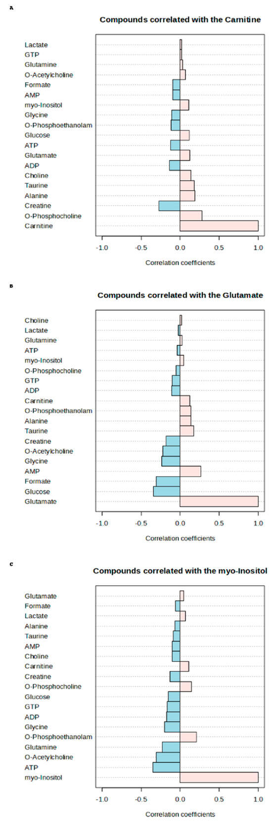 Spearman rho correlation graphs showing the relationship of the three most important biomarker candidate metabolites in sepsis with other metabolites according to SHAP annotations. Graphs are drawn from top to bottom for carnitine (A), glutamate (B), and myo-inositol (C). Pink: positive correlation; Blue: negative correlation.