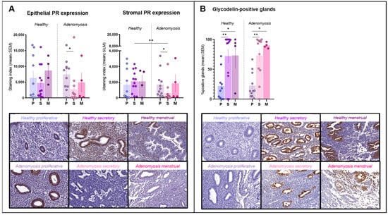 Progesterone receptor (PR) and glycodelin immunostaining. (A) Epithelial and stromal PR expression in healthy endometrium and adenomyosis according to the different phases of the menstrual cycle (epithelium: * p = 0.0185; stroma: ** p = 0.004; * p = 0.0102,). (B) Percentages of glycodelin-positive glands in healthy endometrium and adenomyosis according to the different phases of the menstrual cycle (** p = 0.0024; 0.005, * p = 0.0452; 0.0357).