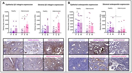Integrin β3 and osteopontin immunostaining. (A) Epithelial and stromal integrin β3 expression in healthy endometrium and adenomyosis according to the different phases of the menstrual cycle (epithelium: * p = 0.03; stroma: * p = 0.0292). (B) Epithelial and stromal osteopontin expression in healthy endometrium and adenomyosis according to the different phases of the menstrual cycle (epithelium: * p = 0.0275; stroma: * p = 0.0301).