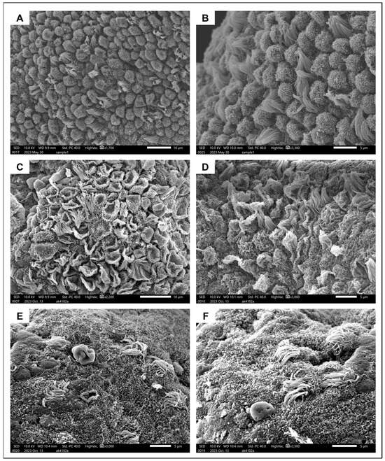 Ultrastructural appearance of pinopodes. (A,B) Surface epithelium from the healthy endometrium covered in fully formed developing pinopodes interposed with ciliated cells. (C,D) Regressing pinopodes and several ciliated cells on endometrial surface epithelium from an adenomyosis patient. (E,F). Different areas of endometrium from the same adenomyosis patient, where pinopodes are now completely absent and very few ciliated cells remain.