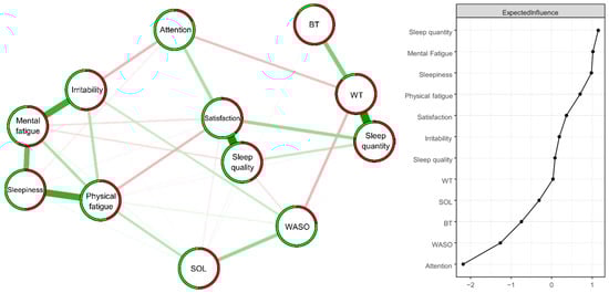 The strongest positive edges (superior to two standard deviations) were “Sleep quality”—“Sleep satisfaction” (2.43) and “Sleep quantity”—“Waking time” (2.42), followed by “Physical fatigue”—“Sleepiness” (1.86), Mental fatigue”—“Irritability” (1.79), and “Mental fatigue”—“Sleepiness” (1.36) (superior to one standard deviation). The strongest negative edges (superior to one standard deviation) were “Irritability”—“Attention” (−1.27), “Waking time”—“WASO” (−1.26), “Physical fatigue”—“Sleep satisfaction” (−1.23) and “Waking time”—“Attention” (−1.19).