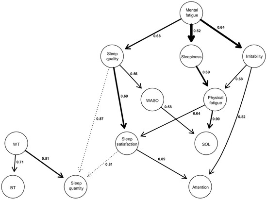 Firstly, the thickness of the arrow is proportional to the BIC value corresponding to this arrow. The thicker the arc, the more negative the BIC score, and the more it contributes to the overall network structure [25]. In this way, the most important arrows in the network connect “Mental Fatigue” to “Sleepiness” (BIC = −69.20), “Mental Fatigue” to “Irritability” (BIC = −67.62), “Sleep quality” to “Sleep satisfaction” (BIC = −61.63), and “Sleepiness” to “Physical Fatigue” (BIC = −49.70).