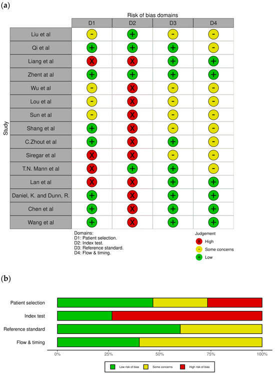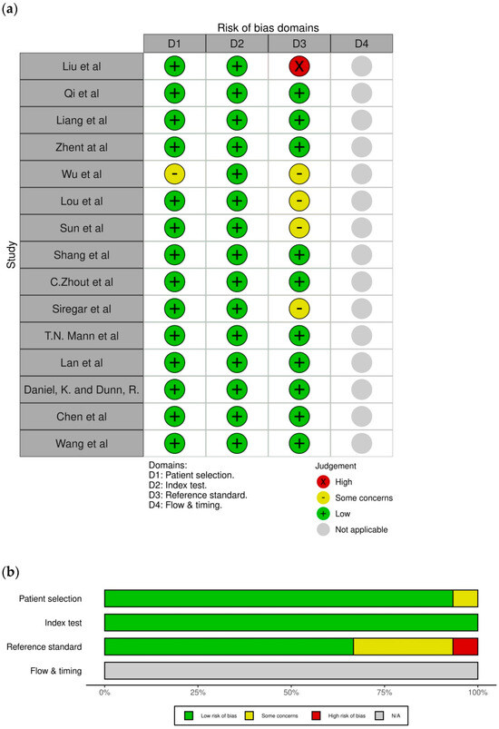 - Whiting, P.F.; Rutjes, A.W.S.; Westwood, M.E.; Mallett, S.; Deeks, J.J.; Reitsma, J.B.; Leeflang, M.M.; Sterne, J.A.; Bossuyt, P.M.; QUADAS-2 Group. QUADAS-2: A Revised Tool for the Quality Assessment of Diagnostic Accuracy Studies. Ann. Intern. Med. 2011, 155, 529–536. Available online: https://www.acpjournals.org/doi/abs/10.7326/0003-4819-155-8-201110180-00009 (accessed on 15 April 2024). [CrossRef]