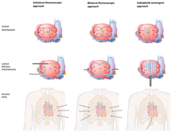 There are two strategies of hybrid ablation based on surgical access to the pericardium, namely thoracoscopic and subxiphoid/transdiaphragmatic access (hybrid convergent procedure).