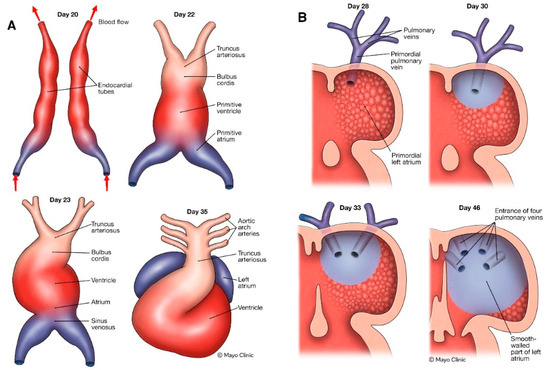 A chronological illustration of (A) the embryological development of the heart and great vessels and (B) the embryological development of the left-atrial posterior wall and pulmonary veins.