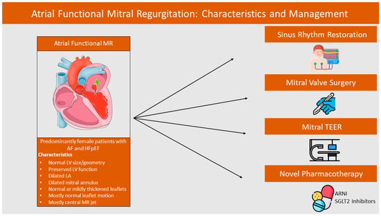 - Farhan, S.; Silbiger, J.J.; Halperin, J.L.; Zhang, L.; Dukkipati, S.R.; Vogel, B.; Kini, A.; Sharma, S.; Lerakis, S. Pathophysiology, Echocardiographic Diagnosis, and Treatment of Atrial Functional Mitral Regurgitation. J. Am. Coll Cardiol. 2022, 80, 2314–2330. [Google Scholar] [CrossRef] [PubMed]