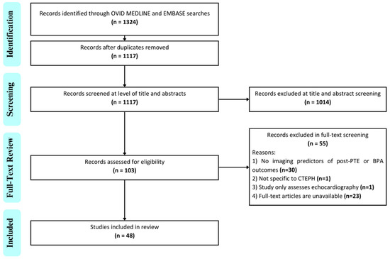 This retrospective scoping review was conducted using the frameworks outlined by Arksey and O’Malley and Levac et al. [8,9]. The search strategy was developed with the assistance of librarians and involved two databases, plus gray literature searches following the Preferred Reporting Items for Systematic Reviews and Meta-Analyses for Scoping Reviews (PRISMA-ScR) [10]. A search was performed to identify if previous systematic or scoping reviews with similar research questions have been conducted. Six systematic reviews were identified and none had significant overlap with the proposed research question (Supplementary Table S1). Two databases, including OVID MEDLINE (1946–present) and EMBASE (1947–present), were searched on the concepts of ‘thoracic imaging’, ‘CT’, ‘MRI’, ‘ventilation–perfusion ratio’, ‘digital subtraction angiography’, ‘CTEPH’, ‘endarterectomy’ or ‘balloon angioplasty’ from inception up to March 2023. The full search strategy is available in the Supplementary Material. Gray literature was searched to identify relevant non-indexed literature such as conference proceedings, research reports, doctoral dissertations, by querying non-indexed citations in OVID MEDLINE and searching the archived OpenGrey database for the terms ‘CTEPH’, ‘PTE’, ‘BPA’, and associated imaging modalities. There were no restrictions on the year of publication. A protocol outlining the proposed search strategy, eligibility criteria, data extraction, outcomes, and analysis of this scoping review was registered a priori on Open-Science Framework [11].