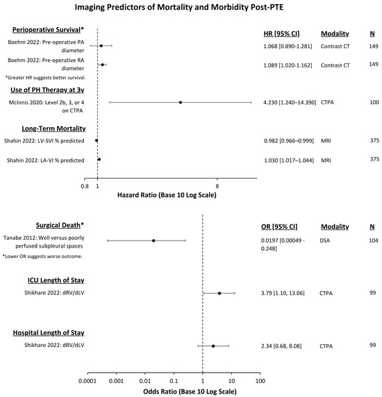 Imaging predictors of post-PTE mortality and morbidity outcomes that were reported with multivariate OR or HR with 95% CIs [13,20,25,30,31]. Hazard ratios and odds ratios are presented in separate forest plots. A base 10 logarithmic scale is used to facilitate wide confidence intervals. Use of PH therapy refers to patients requiring targeted medical therapy after PTE. Level 2b refers to disease in the basal trunk superior to segmental pulmonary artery, level 3 refers to disease starting in segmental pulmonary arteries within 1cm of origin, and level 4 refers to disease starting > 1 cm from origin of the segmental vessel and located mainly in the subsegmental vessel. “N” refers to the number of patients in each study. Abbreviations: PTE = pulmonary thromboendarterectomy, PA = pulmonary artery, RA = right atrium, PH = pulmonary hypertension, CTPA = computed tomography pulmonary angiogram, LV-SVI = left ventricular stroke volume index, LA-VI = left atrial volume index, dRV/dLV = right ventricle diameter/left ventricle diameter, MRI = magnetic resonance imaging, DSA = digital subtraction angiography, HR = hazard ratio, and OR = odds ratio.