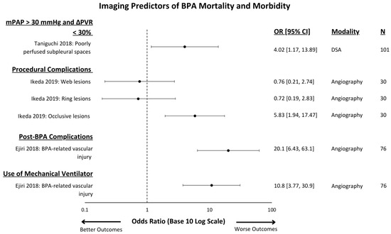 Imaging predictors of post-BPA outcomes that were reported with multivariate ORs and 95% CIs [19,32,33]. All predictors presented are angiographic findings. A base 10 logarithmic scale is used to facilitate wide confidence intervals. “N” refers to the number of patients in each study. Abbreviations: BPA = balloon pulmonary angioplasty, mPAP = mean pulmonary artery pressure, PVR = pulmonary vascular resistance, DSA = digital subtraction angiography, OR = odds ratio.