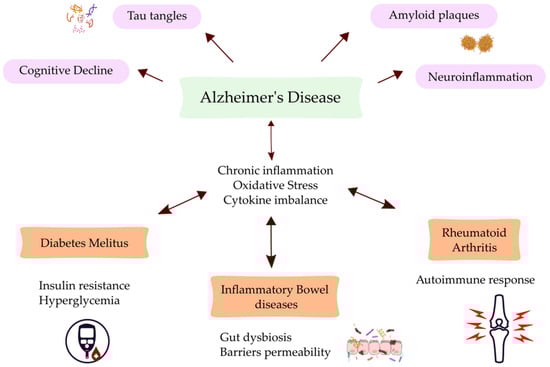 Alzheimer’s Disease, a neurodegenerative disorder leading to progressive cognitive decline, has traditionally been viewed through the lens of neuropathology. However, growing evidence suggests that metabolic abnormalities, such as insulin resistance and dyslipidemia, play critical roles in its pathogenesis. Similarly, diabetes (DM), characterized by chronic hyperglycemia and metabolic instability, is now understood to have profound effects on the nervous system, potentially accelerating neurodegenerative processes. Rheumatoid arthritis (RA), an autoimmune condition that primarily targets synovial joints, shares common inflammatory pathways with AD, suggesting that chronic systemic inflammation may be a crucial link between these diseases. The inflammation observed in RA is not confined to the joints but can have widespread effects, implicating immune system dysregulation as a shared factor. Moreover, irritable bowel diseases (IBD), encompassing Crohn’s disease and ulcerative colitis, involve chronic inflammation of the gastrointestinal tract. These conditions also demonstrate significant overlap with both metabolic and immune dysfunctions seen in AD, DM, and RA. The gut–brain axis and gut–immune interactions highlight a complex network of bidirectional communication that can influence disease progression and manifestation across these conditions.