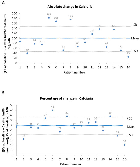 Absolute change (A) and percentage decrease (B) in calciuria after treatment with calcium magnesium phytate (InsP6) for all patients. Values are expressed as absolute change (Ca 0 months-Ca at 6 months) or percentage of change [(Ca 0 months − Ca at 6 months)/Ca at 0 months] × 100.